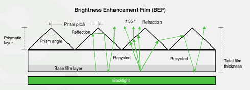 BEFs increase brightness by the use of refraction to redirect light within a viewing cone of 35° and reflection to recycle light that falls outside this cone.