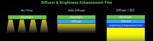 - Increased brightness: BEFs increase the luminance of the display by reflecting and directing the light that would otherwise be wasted. This results in a brighter display without requiring additional power for the backlight.